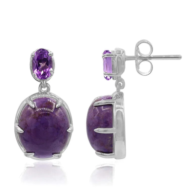 Entdecken Sie die Anziehungskraft dieser atemberaubenden Ohrringe mit der mystischen türkischen Jade im ovalen Cabochon-Schliff, gepaart mit funkelnden brasilianischen Amethysten mit einem Gesamtkaratgewicht von 9,724 ct. Die Ohrringe sind aus hochwertigem 925er Sterling Silber gefertigt und wiegen zusammen 4,24 g. Sie sind perfekt geeignet, um sowohl tagsüber als auch abends einen Hauch von Eleganz zu vermitteln. Die satten violetten Farbtöne passen zu jeder Jahreszeit und sind ein außergewöhnliches Geschenk für eine besondere Person oder eine wertvolle Ergänzung Ihrer eigenen Sammlung.