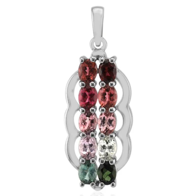 Schmücken Sie sich mit den leuchtenden Farben Brasiliens mit diesem exquisiten Anhänger aus 925er Sterlingsilber. Er zeigt 10 Turmaline im Ovalschliff mit insgesamt 1,445 Karat, die ein Spektrum von Rosarot bis zu sattem Grün ausstrahlen. Jeder Edelstein ist sorgfältig gefasst und zeugt von außergewöhnlicher Handwerkskunst. Dieser Anhänger eignet sich perfekt, um sowohl der Freizeit- als auch der Gesellschaftskleidung einen Hauch von Eleganz zu verleihen und ist ein Muss für jede Sammlung.