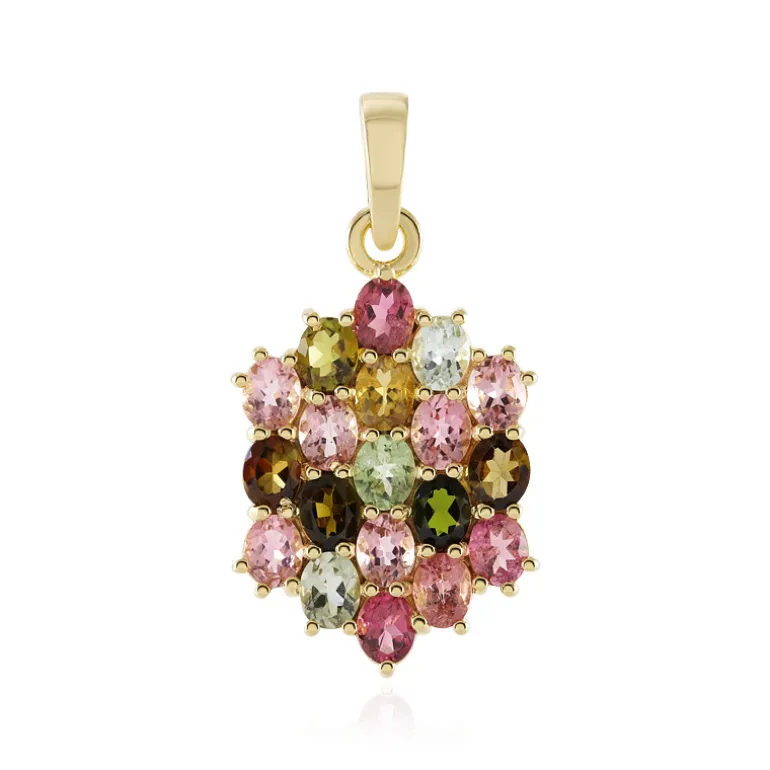 Lassen Sie sich von diesem vergoldeten Silberanhänger mit einer reizvollen Ansammlung von Madagaskar-Turmalinen verzaubern. Die oval geschliffenen Edelsteine haben ein Gesamtgewicht von 5,529 Karat und präsentieren ein Spektrum von Farben, die das Licht wunderschön einfangen. Das filigrane 39×21 mm große Design ist aus hochwertigem 925er Sterlingsilber gefertigt und mit einer luxuriösen Vergoldung versehen, die jedem Ensemble einen Hauch von Eleganz verleiht. Dieser Anhänger ist ein stilvolles Accessoire für besondere Anlässe oder ein opulentes Geschenk für einen lieben Menschen.