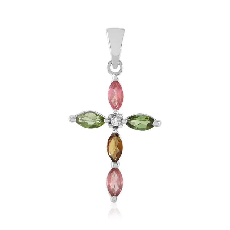 Dieser bezaubernde, mehrfarbige Turmalin-Anhänger aus schimmerndem, platiniertem 925er Sterlingsilber besteht aus fünf Turmalinen im Marquiseschliff aus Madagaskar und einem runden Zirkon aus Kambodscha. Die leuchtenden Farben der Edelsteine machen ihn zu einem auffälligen Schmuckstück, das jedem Outfit einen Hauch von Eleganz verleiht. Dieser Anhänger eignet sich sowohl für legere als auch für formelle Anlässe und ist eine vielseitige Ergänzung für Ihre Schmucksammlung.