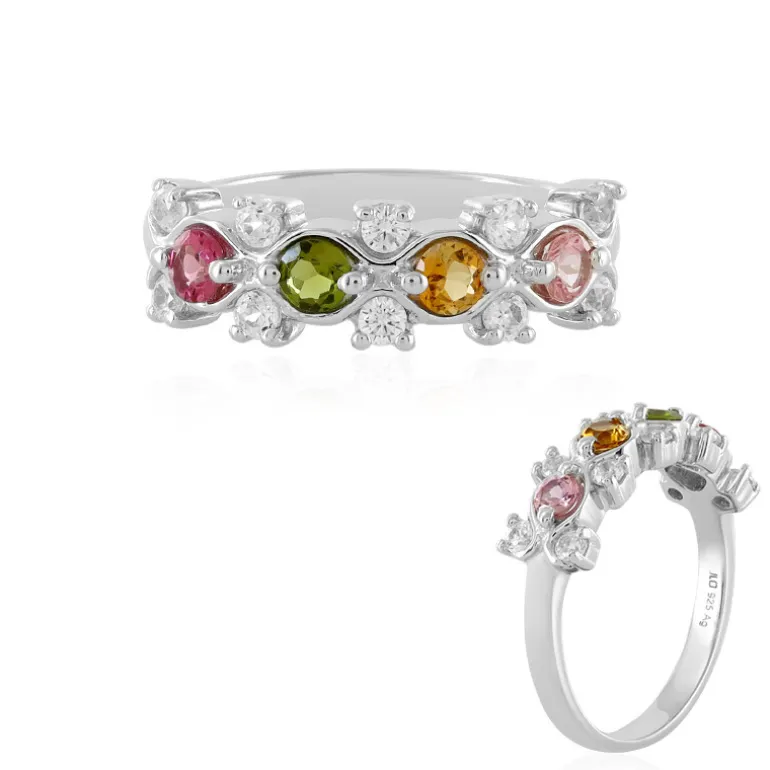 Erleben Sie eine Kaskade von Farben mit diesem erhabenen Multicolor Turmalin Sterling Silber Ring. Jeder der vier Turmaline aus Mosambik zeigt eine Symphonie von Farben, die von tiefen Olivtönen über sattes Gold bis hin zu errötenden Rosatönen reichen, und wird von zehn funkelnden Zirkonen aus Tansania elegant ergänzt. Das aus 925er Sterlingsilber gefertigte und mit einer luxuriösen Platinplattierung versehene Schmuckstück wiegt etwa 2,7 Gramm und bietet ein perfektes Gleichgewicht zwischen Ausgewogenheit und Prominenz. Dieser Ring von Juwelo mit einem Gesamtgewicht von 0,78 Karat ist eine vielseitige Ergänzung zu jedem Outfit. Er ist ideal, um sowohl Tages- als auch Abendkleidung mit seinem lebhaften Charme und seinem polierten Finish aufzuwerten.