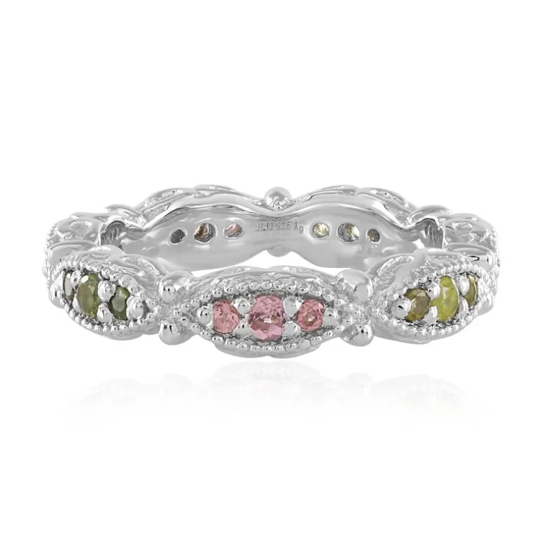 Entdecken Sie die Anziehungskraft dieses bezaubernden Rings aus Sterlingsilber mit einer verspielten Anordnung von mehrfarbigen Turmalin-Edelsteinen. Sein einzigartiges Design lenkt den Blick auf das harmonische Gleichgewicht der leuchtenden Farbtöne, die in ein glänzendes Silberband mit einem verschlungenen, wellenförmigen Muster eingefasst sind. Dieser Ring eignet sich perfekt, um im Alltag einen Farbtupfer zu setzen oder ein abendliches Ensemble zu ergänzen. Er ist eine vielseitige Ergänzung Ihrer Schmucksammlung.