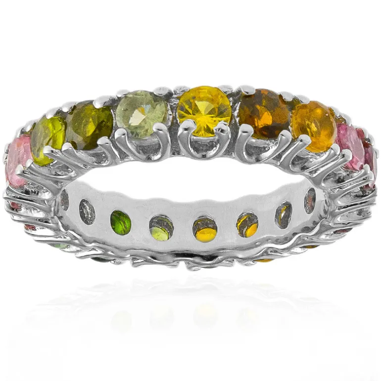 Enthüllen Sie die Pracht der Natur mit diesem aufwendig gestalteten Ring aus Sterlingsilber, der eine atemberaubende Auswahl an mehrfarbigen Turmalin-Edelsteinen präsentiert. Die lebhaften Farbtöne der Steine sind in einer einzigartigen Verteilung über das Band gefasst und bieten ein verspieltes und dennoch schickes Accessoire, das sich für verschiedene Anlässe eignet. Kombinieren Sie diesen vielseitigen Ring mit jedem Outfit, um einen farbigen und eleganten Akzent zu setzen.