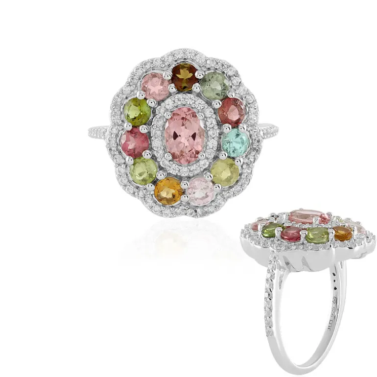 Dieser auffällige Ring präsentiert eine Symphonie von Farben mit einem ovalen, rosafarbenen nigerianischen Turmalin als Herzstück, umrahmt von einer eleganten Reihe von Turmalinen im Rundschliff aus Madagaskar und funkelnden Zirkon-Akzenten aus Kambodscha, alle gefasst in platiniertem 925er Sterling Silber. Das verschlungene Design strahlt einen verspielten und doch raffinierten Charme aus, der sich perfekt eignet, um sowohl legere als auch formelle Ensembles mit einem Farbtupfer zu versehen. Mit einem Gesamtgewicht von 2,622 ct ist dieses Schmuckstück ein wahres Fest für die Palette der Natur.