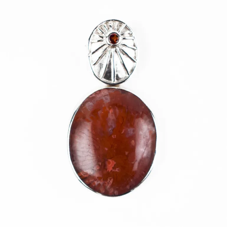 Fossilisierte rote Hornkoralle & Granat Silberanhänger, 23ct USA