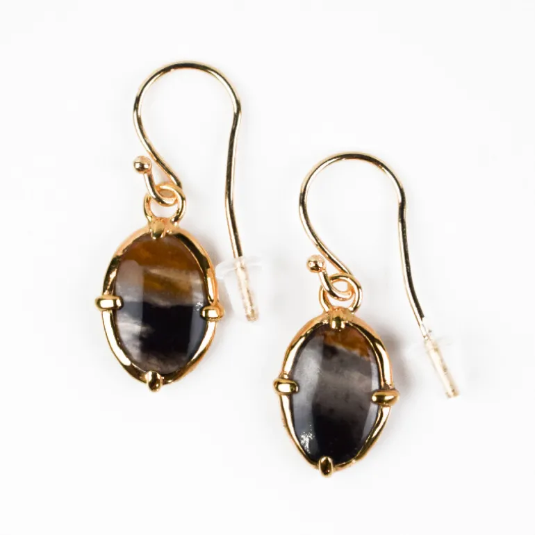Entdecken Sie die Faszination der Geschichte mit diesen exquisiten Ohrringen aus versteinertem indonesischem Palmenholz. Die Ohrringe sind aus 8 Karat ovalen Cabochon-Steinen gefertigt und in luxuriösem 925er Sterlingsilber mit strahlender Goldplattierung gefasst. Sie wiegen ca. 1,8 g und baumeln elegant an ihrem 28-mm-Fall, was sie zu einer fesselnden Ergänzung für jedes Outfit macht – perfekt für ein legeres Brunch oder eine anspruchsvolle Abendveranstaltung.