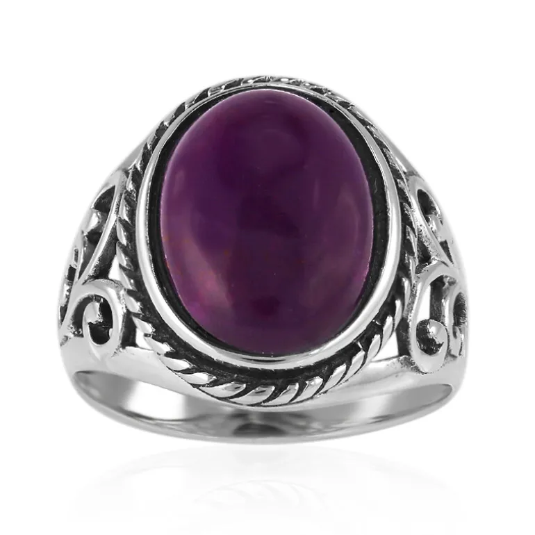 Entdecken Sie die Anziehungskraft unseres majestätischen lila Mohave-Türkisrings, eines Edelsteins aus dem Herzen der USA. Dieser 2,21 Karat schwere ovale Cabochon ist perfekt in ein fein gearbeitetes 925er Sterling Silberband eingebettet und wiegt etwa 2,63 Gramm. Der 13×9,5 mm große Stein sorgt für Gesprächsstoff und ist damit die ideale Wahl für legere und formelle Anlässe. Kombinieren Sie diesen Ring mit helleren Farbtönen, um das tiefe Violett hervorzuheben und Ihrem Ensemble einen Hauch von Raffinesse zu verleihen.