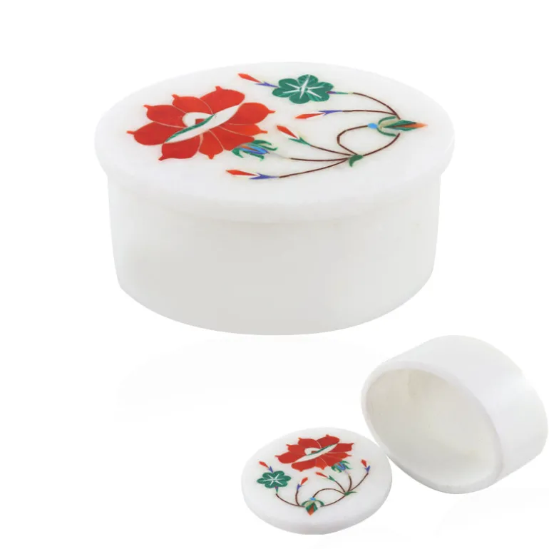 Entdecken Sie die zeitlose Eleganz dieser handgefertigten Schmuckschatulle aus makellosem indischem Marmor. Der Deckel ist wunderschön mit einem komplizierten Blumenmosaik verziert, das aus einer Vielzahl von Edelsteinen besteht, darunter Lapislazuli aus Afghanistan, brasilianischer Karneol, amerikanischer Türkis, Malachit aus der DR Kongo und chinesisches Perlmutt. Mit einer Größe von 105 x 50 mm hat diese Box ein Gesamtgewicht von 1,850 Karat. Das Kästchen bietet einen sicheren Aufbewahrungsort für Ihren kostbaren Schmuck und verleiht Ihrer Eitelkeit einen luxuriösen Touch. Perfekt zum Verschenken oder als schickes Wohnaccessoire, das Raffinesse und Weltgewandtheit widerspiegelt.