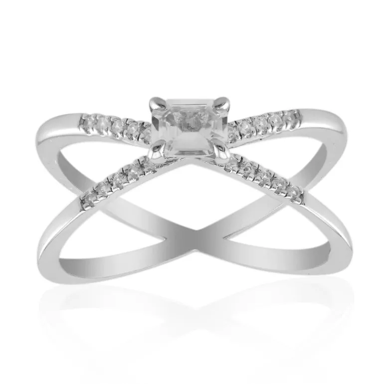 Entdecken Sie die Eleganz dieses Madagaskar White Sapphire Sterling Silver Ring. Verziert mit einem weißen Saphir im Oktagon-Schliff (0,438 Karat) und 20 Zirkonen im Rundschliff (0,133 Karat) bietet dieser Ring ein modernes Kreuzdesign, das jedem Outfit einen Hauch von Raffinesse verleiht. Der Ring ist aus platiniertem 925er Sterlingsilber gefertigt und eignet sich perfekt für besondere Anlässe oder den Alltag. Kombinieren Sie ihn mit einem eleganten Abendkleid oder einem professionellen Ensemble für einen raffinierten letzten Schliff.