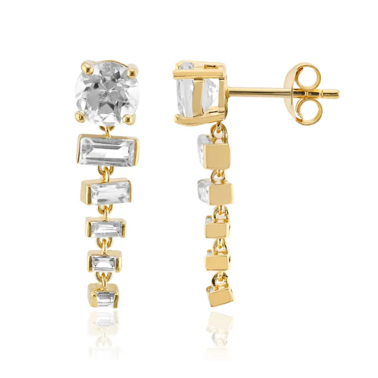 Diese Ohrringe aus weißem Topas sind eine faszinierende Mischung aus Steinen im Rund- und Baguetteschliff aus Nigeria mit einem Gesamtgewicht von 3,004 ct. Sie sind aus vergoldetem 925er Sterlingsilber gefertigt und bieten mit einer Länge von 23 mm einen Hauch von Eleganz. Diese Ohrringe sind perfekt für besondere Anlässe oder um Ihren alltäglichen Stil aufzuwerten. Sie schimmern wunderschön in jedem Licht und passen sowohl zu lässigen als auch zu formellen Ensembles.