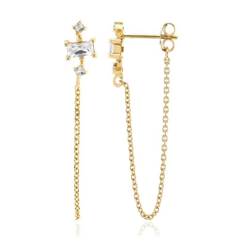 Diese exquisiten Ohrringe mit nigerianischem Weißtopas im Baguette- und Rundschliff sind in vergoldetes 925er Sterlingsilber gefasst. Mit ihrem zarten Kettendesign bieten sie einen Hauch von Eleganz und Raffinesse. Diese Ohrringe sind sowohl für den Tag als auch für den Abend geeignet und werten jedes Outfit durch ihr strahlendes Funkeln auf. Ideal für Hochzeiten, Partys oder einen stilvollen Alltagslook.