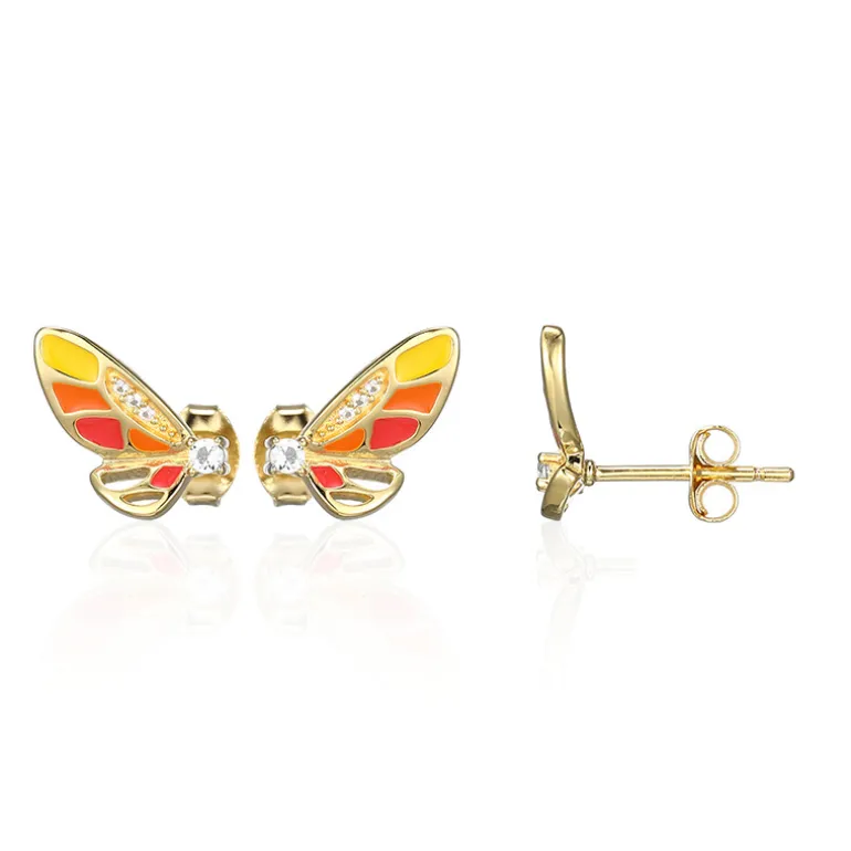 Fangen Sie die Essenz des Frühlings ein mit diesen vergoldeten Ohrringen aus Sterlingsilber, die wie zarte Schmetterlinge geformt und mit brasilianischen weißen Topasen verziert sind. In der Mitte jedes Ohrrings funkelt ein Topas im Rundschliff von 0,054 Karat und verleiht ihm einen Hauch von Eleganz. Die leuchtend orangefarbenen und gelben Emaille-Flügel bilden einen verspielten Kontrast und machen sie zu einer fröhlichen Ergänzung für jedes Outfit. Perfekt für den Alltag oder besondere Anlässe, die einen skurrilen Touch erfordern.