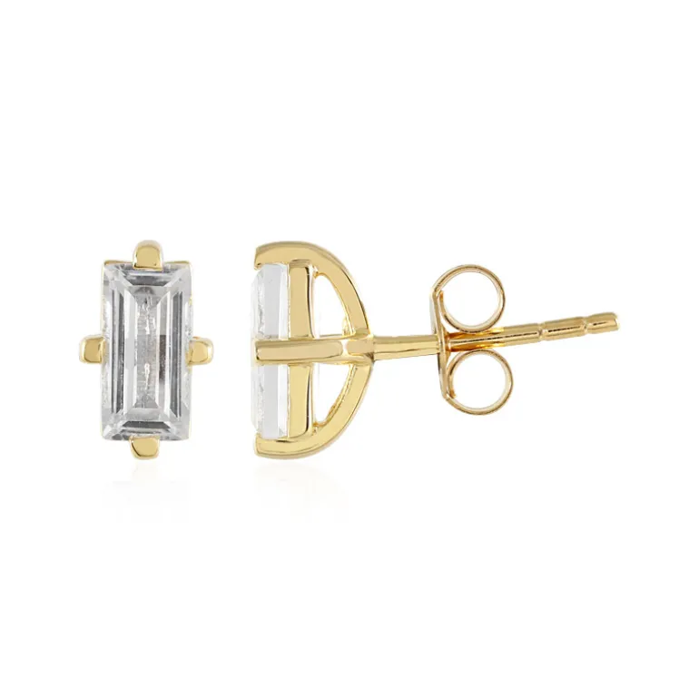 Diese Ohrstecker sind eine harmonische Mischung aus Raffinesse und Brillanz und zeigen die Pracht des brasilianischen weißen Topas. Die 1,88 Karat schweren Edelsteine sind in eleganten Baguette-Formen geschliffen und funkeln mit zeitloser Anmut. Die Ohrringe sind aus vergoldetem 925er Sterlingsilber gefertigt und bieten Luxus ohne Kompromisse. Das schlichte Design ist vielseitig und wertet sowohl Alltagsoutfits als auch Abendgarderobe auf. Diese Kostbarkeiten sind ein durchdachtes Geschenk oder ein fester Bestandteil Ihrer Schmucksammlung.