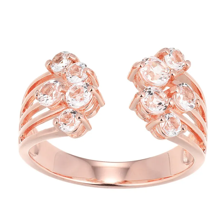 Dieser auffällige Ring aus rosé-vergoldetem 925er Sterlingsilber besticht durch eine große Ansammlung von brasilianischen weißen Topasen mit insgesamt 0,78 Karat. Die wunderschön geschliffenen runden Edelsteine strahlen aus einem einzigartigen durchbrochenen Design und bieten sowohl Raffinesse als auch brillantes Funkeln. Seine moderne Silhouette macht ihn zur idealen Wahl, um Ihrer Abendgarderobe einen Hauch von Eleganz zu verleihen oder ein luxuriöses Highlight für Ihre Alltagskleidung zu setzen.