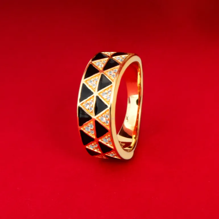 Entdecken Sie die geometrische Eleganz dieses atemberaubenden Rings aus vergoldetem 925er Sterlingsilber, der mit insgesamt 39 funkelnden weißen Topas-Edelsteinen aus den üppigen Ländern Brasiliens besetzt ist, die zusammen ein Karatgewicht von 0,117ct ergeben. Der präzise Rundschliff jedes Steins hebt seine Brillanz vor dem geometrischen schwarz-goldenen Muster hervor und sorgt für ein modernes und doch zeitloses Design, das jedes Outfit ergänzt. Egal, ob Sie sich für eine Gala herausputzen oder ein legeres Ensemble schmücken, dieser Ring verspricht, Ihrem Look einen Hauch von Raffinesse zu verleihen.