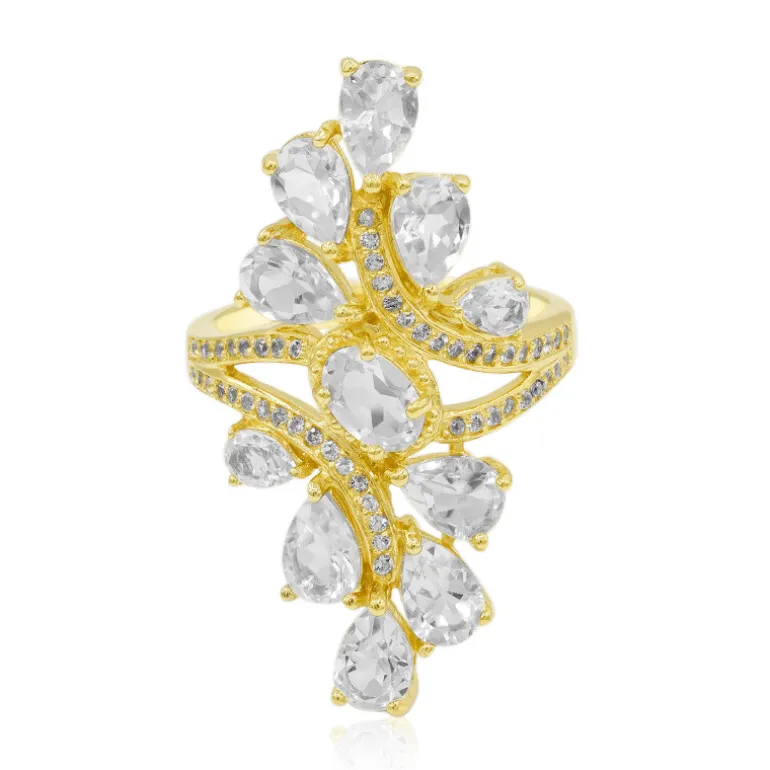 Schmücken Sie Ihre Finger mit diesem exquisiten Ring aus weißem Topas, der mit einer Reihe brillanter nigerianischer weißer Topassteine in vergoldetem 925er Sterlingsilber besetzt ist. Die schillernde Kombination aus Birnen-, Oval- und Rundschliff sorgt für ein elegantes Funkeln in jedem Winkel. Dieser Ring eignet sich perfekt für besondere Anlässe oder als luxuriöses Accessoire für den Alltag und passt sowohl zu formellen als auch zu legeren Outfits.