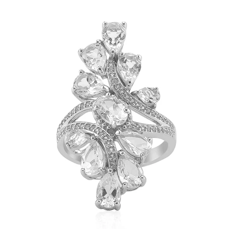 Entdecken Sie die Anziehungskraft unseres Rings mit nigerianischem Weißtopas – ein unverwechselbares Stück, das Raffinesse ausstrahlt. Dieses exquisite Accessoire besteht aus einem Band aus Sterlingsilber, das mit einer Reihe sanft funkelnder weißer Topas-Edelsteine mit einem Gesamtgewicht von ca. 4,34 Karat verziert ist. Die Steine im Oval-, Tropfen- und Rundschliff vereinen sich zu einem schillernden, floralen Motiv, das die Blicke auf sich zieht. Durch sein einzigartiges Design und den reinen Schimmer des 925er Sterlingsilbers eignet sich dieser Ring sowohl für lässige Eleganz als auch für formelle Anlässe. Dieses Schmuckstück wertet Ihre Garderobe auf und verleiht jedem Ensemble einen Hauch von Strahlkraft.