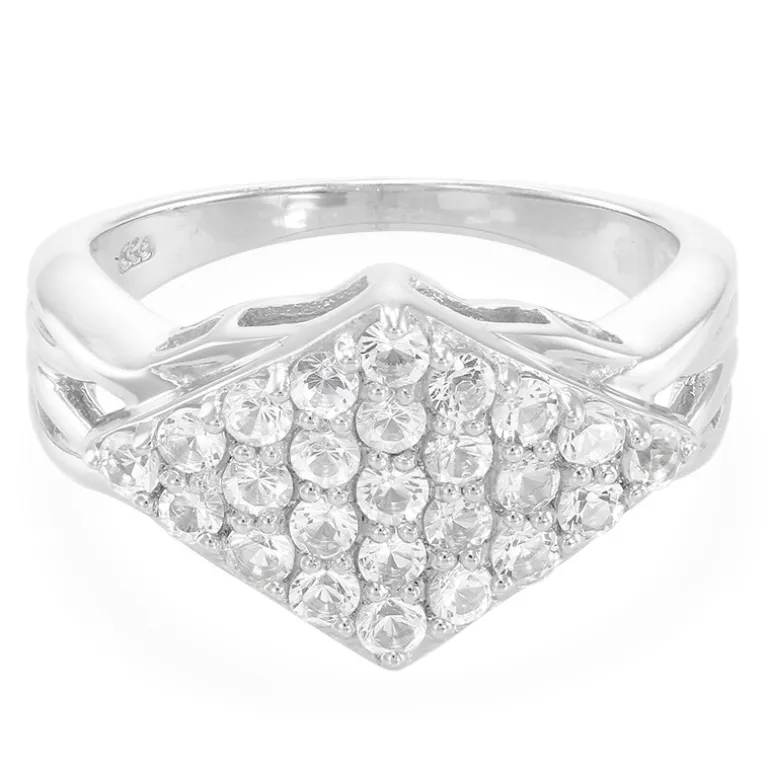 Dieser bezaubernde Ring zeigt eine Konstellation von 25 strahlenden weißen Topasen aus Brasilien, die in einem dreieckigen Muster auf einem eleganten 925er Sterlingsilberband gefasst sind. Die Topase haben ein Gesamtkaratgewicht von ca. 0,996 ct und einen runden Brillantschliff, um ihr Funkeln zu maximieren. Mit einem Gewicht von etwa 4,1 Gramm bietet das Silberband sowohl Haltbarkeit als auch Glanz und macht dieses Schmuckstück zu einer idealen Wahl für das tägliche Tragen oder für besondere Anlässe. Kombinieren Sie diesen Ring mit einer frischen weißen Bluse und einer maßgeschneiderten Hose für einen mühelos eleganten Look oder mit einem kleinen schwarzen Kleid für zusätzlichen Glamour bei einer Nacht.