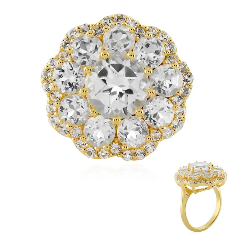 Eine luxuriöse Ansammlung von brasilianischen Weißtopasen bildet das Herzstück dieses exquisiten Rings aus vergoldetem 925er Sterlingsilber. Der zentrale Edelstein mit einem Gewicht von 2,126ct ist umgeben von einer Konstellation aus 9 und 36 Topas-Steinen mit einem Gesamtgewicht von 5,285ct. Dieser 25×19 mm große Ring glitzert und schimmert und fängt das Licht bei jeder Bewegung ein. Der elegante Ring eignet sich perfekt für die Abendgarderobe oder für einen Hauch von Glamour im Alltag.