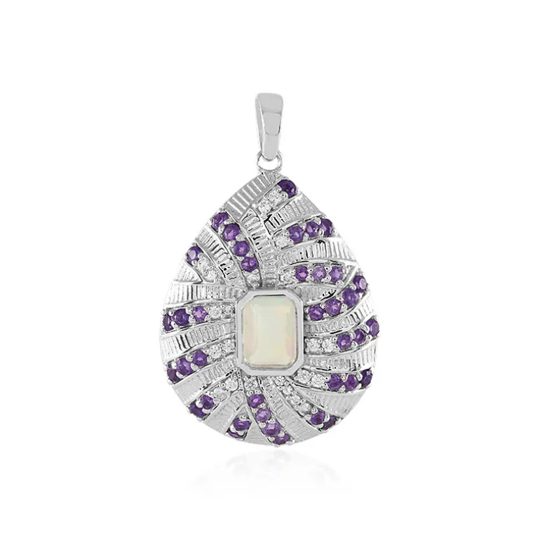 Dieser Anhänger aus Sterlingsilber ist ein Kunstwerk für Ihre Sammlung und zelebriert ein bezauberndes Farbenspiel mit einem äthiopischen Welo-Opal in der Mitte, flankiert von einer Konstellation aus funkelnden brasilianischen Amethysten und strahlenden Zirkonen aus Kambodscha. Das verschlungene Design, das an die Eleganz des Vintage-Stils erinnert, ist mit Platin plattiert und schimmert bezaubernd. Er ist ideal, um sowohl der Tages- als auch der Abendgarderobe einen Hauch von Raffinesse zu verleihen und ist ein Schmuckstück in Erbstückqualität, das bei jeder Veranstaltung glänzt.