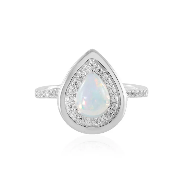 Entdecken Sie die Faszination dieses ätherischen Welo-Opal-Tropfenrings, der einen fesselnden Edelstein von 0,611 Karat aus Äthiopien präsentiert. Umgeben von einem Halo aus funkelnden kambodschanischen Zirkonen von insgesamt 0,344 Karat, strahlt dieses Schmuckstück zeitlose Anmut aus. Die Fassung aus platiniertem 925er Sterlingsilber umspielt das schillernde Farbenspiel des Opals auf zauberhafte Weise. Er strahlt moderne Eleganz aus und eignet sich perfekt, um jedem Outfit einen Hauch von Raffinesse zu verleihen, und passt nahtlos von Tagesveranstaltungen bis zu abendlichen Soireen.