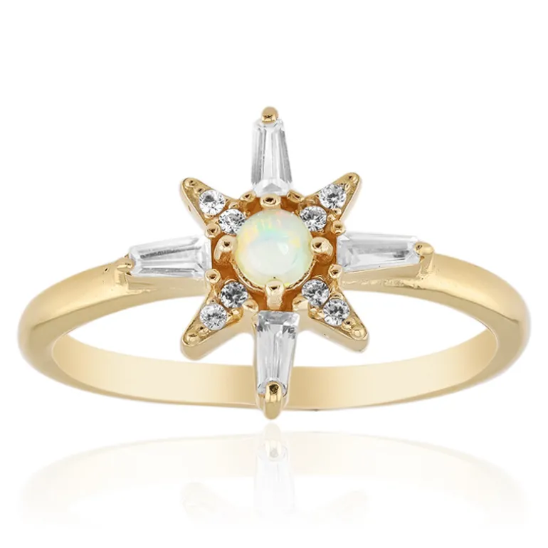 Entdecken Sie die Eleganz dieses atemberaubenden äthiopischen Welo-Opal-Rings mit einem runden Cabochon-Opal von 0,068 Karat in der Mitte, umgeben von schimmernden Zirkon-Akzenten aus Tansania. Der Ring ist aus vergoldetem 925er Sterlingsilber gefertigt und strahlt zeitlose Schönheit und Raffinesse aus. Er eignet sich perfekt, um Alltagsoutfits einen Hauch von Luxus zu verleihen oder mit seinem Starburst-Design die Abendgarderobe aufzuwerten.