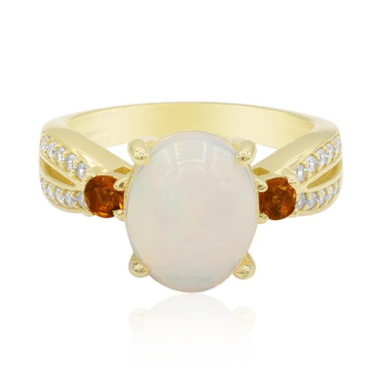 Entdecken Sie den zauberhaften Glanz dieses bezaubernden Rings aus äthiopischem Welo-Opal, der von vergoldetem Sterlingsilber umschlossen wird. Der ovale Cabochon des Opals mit einem Gewicht von 1,89 Karat zeigt ein schillerndes Farbspiel, flankiert vom warmen Schein zweier Madeira-Citrine aus Brasilien. Ein Halo aus 20 kambodschanischen Zirkonsteinen sorgt für ein subtiles Funkeln. Dieser Ring mit einem Gesamtgewicht von 2,268 ct, gefasst in ca. 3,93 g Silber, ist ein exquisiter Abschluss für jedes Outfit, perfekt für Abendveranstaltungen oder besondere Anlässe am Tag.