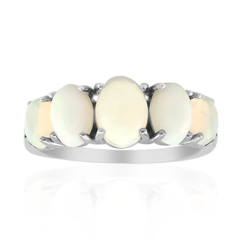 Entdecken Sie das himmlische Farbenspiel unseres schicken äthiopischen Welo-Opalrings, der mit einer Reihe von ovalen Cabochon-Opalen besticht. Dieser Ring aus platiniertem 925er Sterlingsilber hat ein Gesamtkaratgewicht von 1,43 ct und präsentiert ein harmonisches Design, das perfekt ist, um Ihrem Alltagsoutfit einen Hauch von Eleganz zu verleihen. Der Ring ist ideal für Opal-Liebhaber und alle, die ein einzigartiges Schmuckstück suchen. Er ist vielseitig einsetzbar und passt sowohl zu legeren als auch zu formellen Anlässen. Lassen Sie diesen Ring zum Gesprächsthema bei Ihrer nächsten Veranstaltung werden oder zu einer geschätzten Ergänzung Ihrer Sammlung.