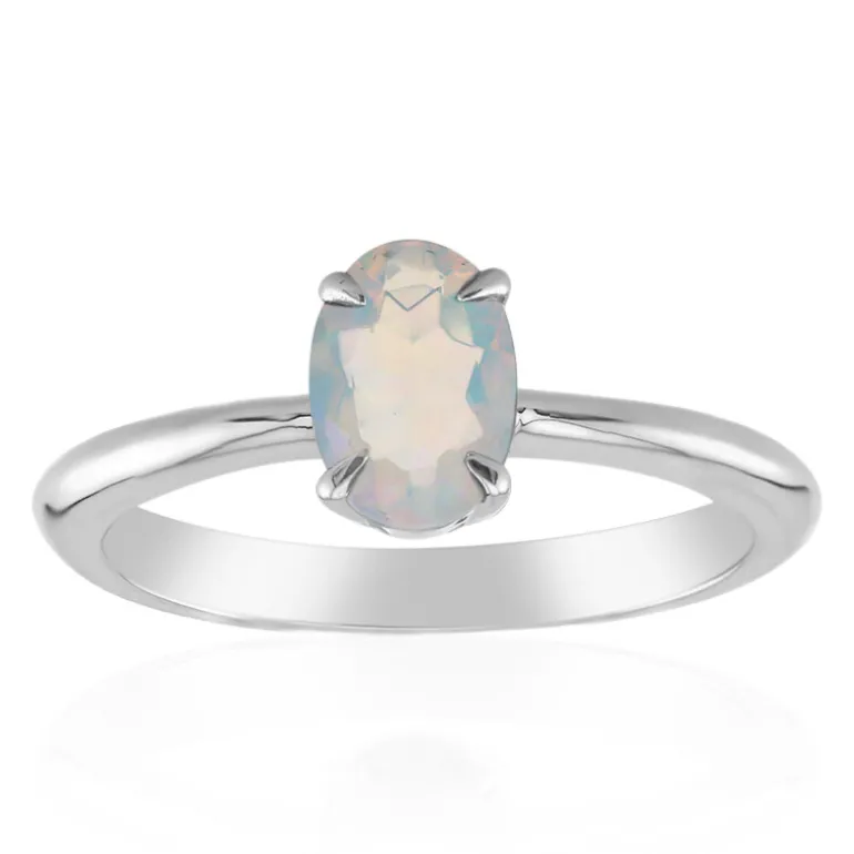 Dieser bezaubernde Ring zeigt einen bezaubernden äthiopischen Welo-Opal mit einem fesselnden Farbenspiel, gefasst in hochglanzpoliertem, platiniertem 925er Sterling Silber. Der oval geschliffene Edelstein wiegt 0,437 Karat und ist anmutig auf einem schlanken, zeitgenössisch gestalteten Band montiert, das Ihrem Outfit einen Hauch von Raffinesse verleiht. Dieser Ring eignet sich sowohl für legere als auch für formelle Anlässe und ist eine vielseitige Ergänzung für jede Schmucksammlung.