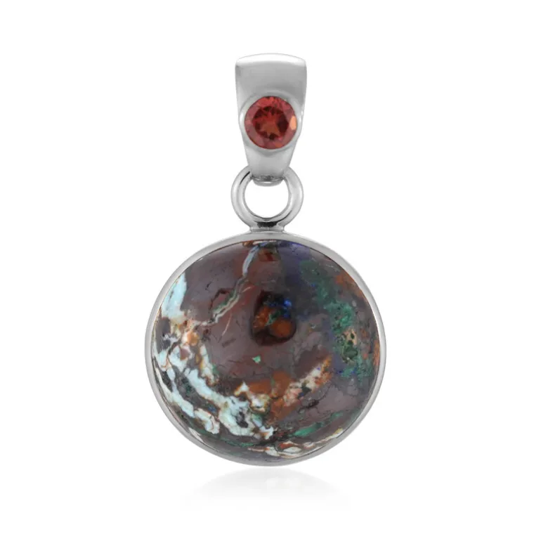 Entdecken Sie den magnetischen Charme dieses kugelförmigen Cabochon-Anhängers aus Zarinit, der durch das Funkeln eines Mosambik-Granats der Güteklasse AAA ergänzt wird. Mit einem beachtlichen russischen Zarinit von 14,6 Karat und einem runden, brillanten Granat von 0,25 Karat vereint dieses Stück aus 925er Sterlingsilber, das für zusätzliche Haltbarkeit und Glanz plattiert wurde, handwerkliches Können mit der Kunst der Natur. Es ist ideal, um ein raffiniertes Abendkleid zu betonen oder eine lässige Bluse aufzuwerten und verspricht, eine vielseitige Ergänzung für jede Schmucksammlung zu sein.