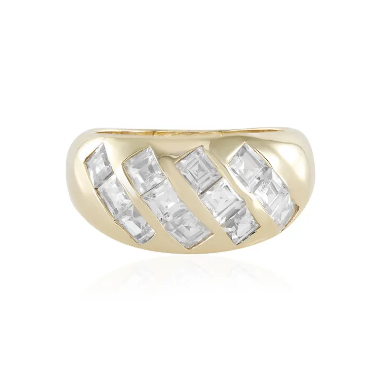 Dieser wunderschön gearbeitete Ring ist ein Schatz mit einer Reihe kambodschanischer Zirkone im Quadratschliff von insgesamt 2,31 Karat. Der Ring ist aus glänzendem 9K-Gelbgold mit einem Gewicht von etwa 3,92 Gramm gefertigt und bringt die Klarheit und Brillanz der Edelsteine zur Geltung. Dieser Ring ist ideal, um sowohl am Tag als auch am Abend einen Hauch von Eleganz zu verleihen. Er ist eine klassische Wahl für die Sammlung eines jeden Schmuckliebhabers.