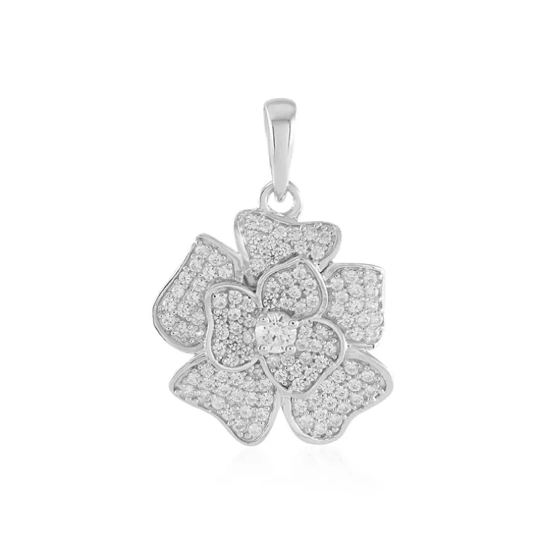 Entdecken Sie das Funkeln dieses wunderschön gearbeiteten Anhängers aus 925er Sterlingsilber, der mit einem Strauß kambodschanischer Zirkon-Edelsteine von insgesamt 0,882 Karat geschmückt ist. Das zarte Blumendesign mit einem zentralen Zirkon im Rundschliff und einer Reihe glitzernder Mikrozirkone spiegelt Eleganz und Perfektion wider. Mit einem Gewicht von ca. 1,9 Gramm und einer Größe von 26×19 mm verleiht dieses leichte Schmuckstück jedem Outfit einen Hauch von Raffinesse. Er ist ideal für besondere Anlässe oder für das tägliche Tragen, denn er ergänzt mühelos ein Cocktailkleid oder verleiht einer legeren Bluse einen Hauch von Glamour.