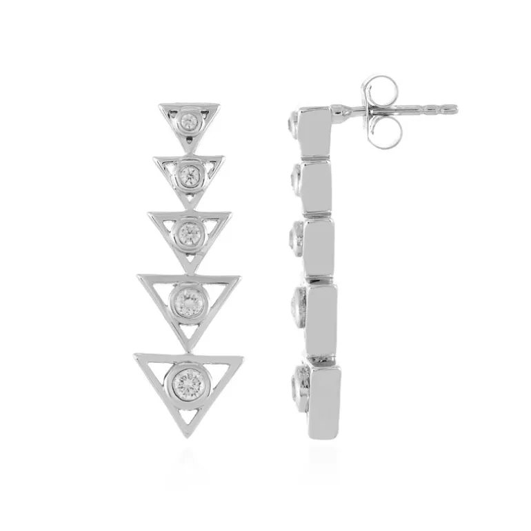 Wir präsentieren unsere geometrischen Kaskaden-Ohrringe aus kambodschanischem Zirkon, ein Meisterwerk aus 925er Sterlingsilber mit einer luxuriösen Platinbeschichtung. Diese Ohrringe weisen ein Gesamtgewicht von 0,714 Karat auf und bestechen durch eine vertikale Anordnung von Zirkonen im Rundschliff, die in ihrer Größe abgestuft sind und einen eleganten und fesselnden Look ergeben. Das makellose und symmetrische Design erstreckt sich bis zu 31 mm und bietet einen eleganten Tropfen, der anmutig schwingt. Diese Ohrringe sind ideal für alle, die eine Mischung aus modernem Stil und klassischer Raffinesse zu schätzen wissen, und werten jedes Outfit auf, von legerem Chic bis hin zur Abendgarderobe.