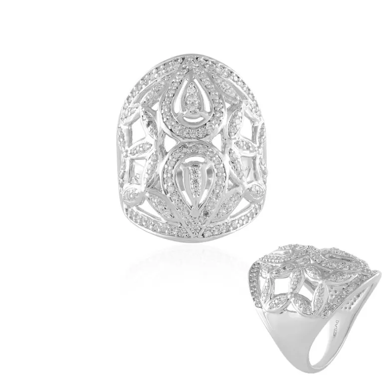 Dieser schicke Ring zeigt 140 kambodschanische Zirkone, die in 925er Sterlingsilber gefasst sind und ein schillerndes Schmuckstück bilden. Mit einem Gesamtkaratgewicht von 0,99 ergänzt das komplizierte Design sowohl legere als auch formelle Outfits auf elegante Weise. Das Schmuckstück eignet sich perfekt, um jedem Anlass einen Hauch von Glanz zu verleihen und ist eine exquisite Ergänzung zu Ihrer Schmucksammlung.
