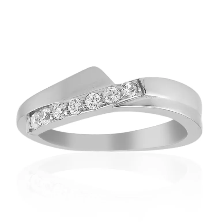 Dieser moderne Ring aus platinbeschichtetem 925er Sterlingsilber besticht durch sein elegantes Design, das mit 7 kambodschanischen Zirkonen im Rundschliff von insgesamt 0,233 ct. verziert ist. Sein dezentes Funkeln und seine moderne Silhouette machen ihn zu einem vielseitigen Schmuckstück, das sowohl zur Tages- als auch zur Abendgarderobe passt. Elegant und langlebig, ist er eine zeitlose Ergänzung für jede Schmucksammlung. Perfekt, um Ihrer Bürokleidung einen Hauch von Eleganz zu verleihen oder ein Cocktailkleid für einen Abend zu verschönern.