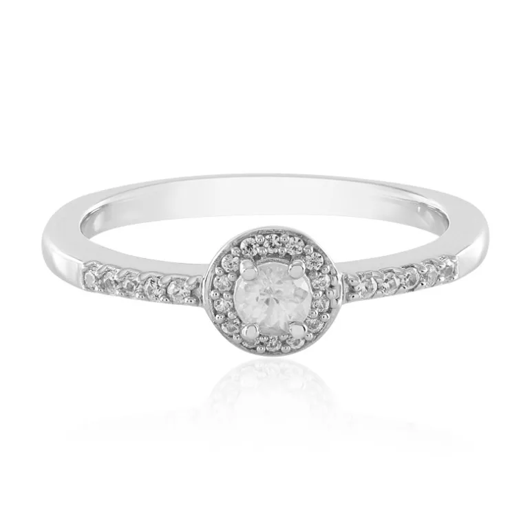 Entdecken Sie die Anziehungskraft des kambodschanischen Zirkons mit diesem bezaubernden Ring, der einen zentralen runden Edelstein im Brillantschliff aufweist, der von einem Kranz glitzernder Zirkon-Akzente umgeben ist. Alles ist sorgfältig in hochwertiges 925er Sterlingsilber mit einer glänzenden Platinbeschichtung gefasst. Mit einem Gesamtkaratgewicht von 0,564 ct bietet dieser Ring sowohl Eleganz als auch Erschwinglichkeit. Sein klassisches Design sorgt dafür, dass er sich nahtlos mit jedem Outfit kombinieren lässt, was ihn sowohl für den Alltag als auch für besondere Anlässe perfekt macht.
