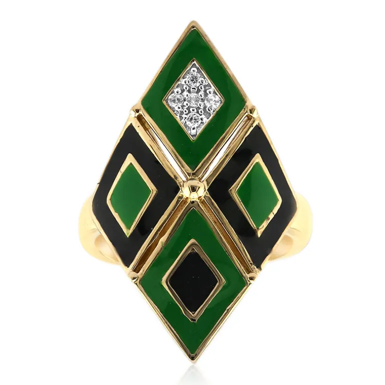 Dieser auffällige Ring bietet eine harmonische Mischung aus Geometrie und Glamour. Er ist aus glänzend vergoldetem 925er Sterlingsilber gefertigt und verfügt über ein kühnes Design, das mit fünf kambodschanischen Zirkonen im Rundschliff von insgesamt 0,054 ct. akzentuiert ist. Die leuchtend grünen und schwarzen Emaille-Intarsien bilden einen auffälligen Kontrast und machen diesen Ring zu einer vielseitigen Ergänzung für Tages- und Abendgarderobe. Seine Silhouette erinnert an den Vintage-Art-Déco-Stil mit modernem Touch, perfekt für modebewusste Menschen, die einen Hauch historischer Eleganz in ihrem Schmuck schätzen. Tragen Sie diesen auffälligen Ring, um Ihrem Outfit einen raffinierten Farbakzent und Glanz zu verleihen.