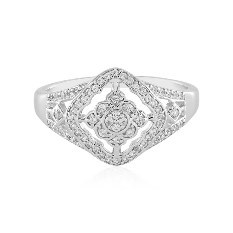 Dieser atemberaubende Ring präsentiert eine Konstellation von 66 kambodschanischen Zirkonsteinen mit insgesamt 0,513 Karat, die meisterhaft in 925er Sterlingsilber gefasst sind. Jeder einzelne Edelstein, der mit einem Präzisionsschliff versehen ist, bietet ein funkelndes Funkeln, das es mit den Sternen aufnehmen kann. Das verschlungene Design mit geometrischen Mustern und einem Blumenmotiv in der Mitte macht diesen Ring zu einem echten Hingucker. Er eignet sich sowohl für den Alltag als auch für besondere Anlässe und ist ein vielseitiges Schmuckstück, das jedem Outfit einen Hauch von Raffinesse verleiht.
