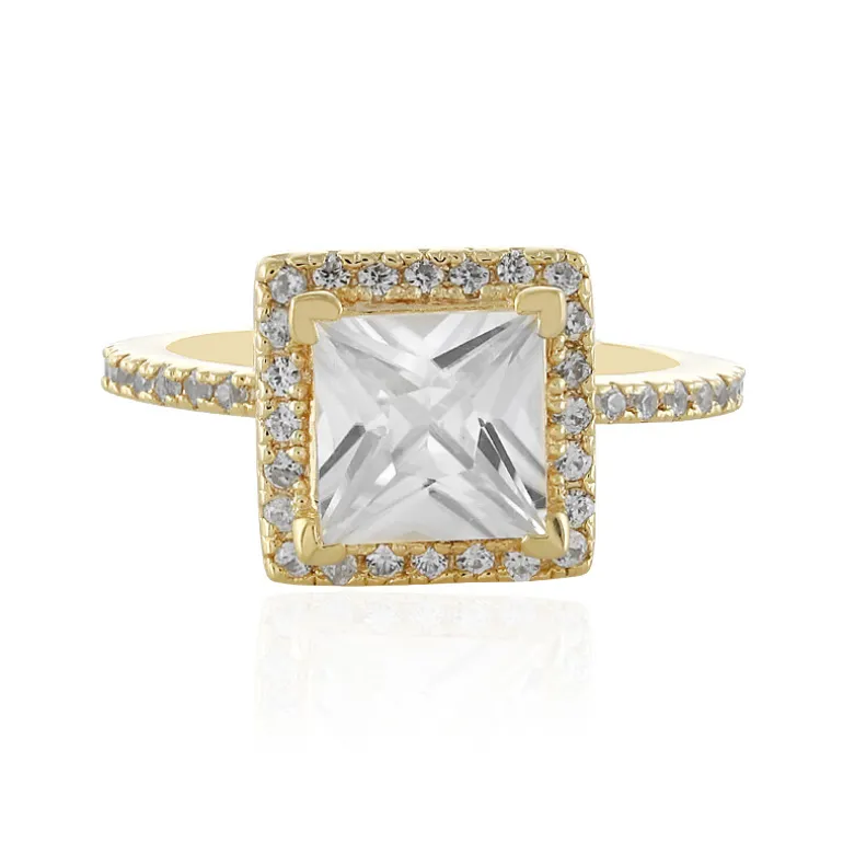 Entdecken Sie die Faszination dieses Rings aus vergoldetem 925er Sterlingsilber mit einem kambodschanischen Zirkon von 2,572 Karat im quadratischen Princess-Schliff in der Mitte, der von 44 Zirkonen im Rundschliff von insgesamt 0,456 Karat umgeben ist. Dieser Ring besticht durch sein klassisches quadratisches Design mit glitzernden Akzenten, die das Licht aus jedem Winkel einfangen. Mit einer Größe von ca. 7 mm und einem Gesamtkaratgewicht von 3,028 ct heben die goldenen Farbtöne das kühle Funkeln der Zirkone perfekt hervor und machen ihn zu einer idealen Wahl sowohl für die Eleganz am Tag als auch für den Glamour am Abend. Kombinieren Sie ihn mit einer eleganten Bluse oder einem raffinierten Abendkleid, um Ihren zeitlosen Look zu vervollständigen.