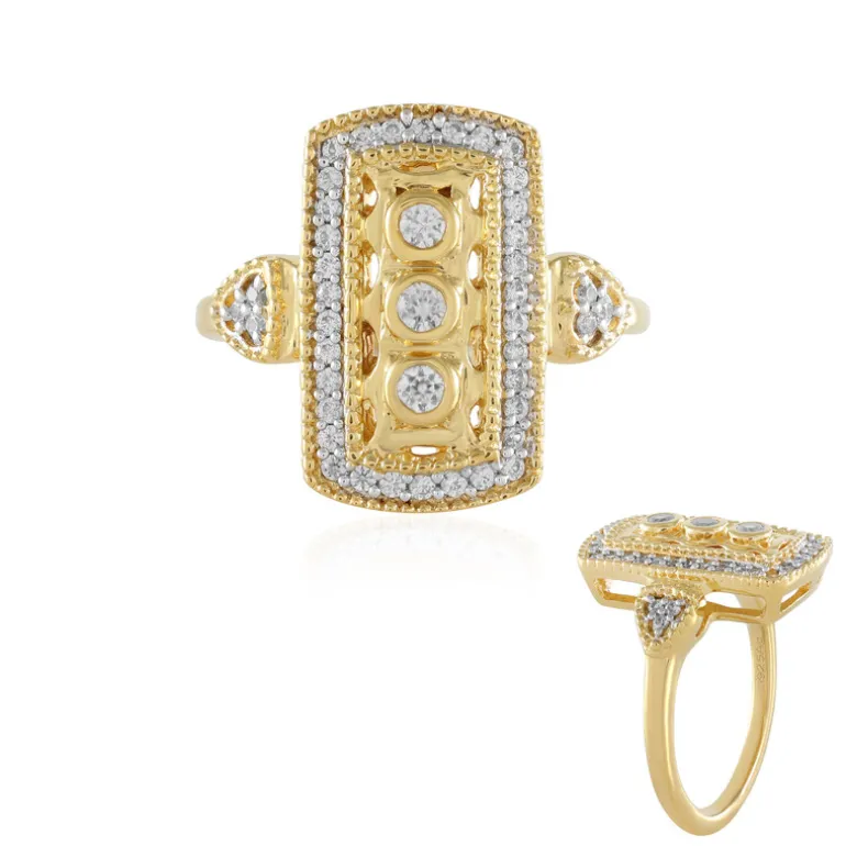 Entdecken Sie die Eleganz dieses vergoldeten Rings aus Sterlingsilber, der mit bezaubernden kambodschanischen Zirkonen besetzt ist. Mit drei zentralen Steinen im Rundschliff von 0,198 Karat und einem schimmernden Halo aus 40 kleineren Zirkonen strahlt dieses Schmuckstück Raffinesse aus. Dieser Ring eignet sich sowohl für glamouröse Abende als auch für schicke Tageslooks. Er ergänzt jedes Outfit und verleiht Ihrer Sammlung einen Hauch von zeitloser Schönheit.