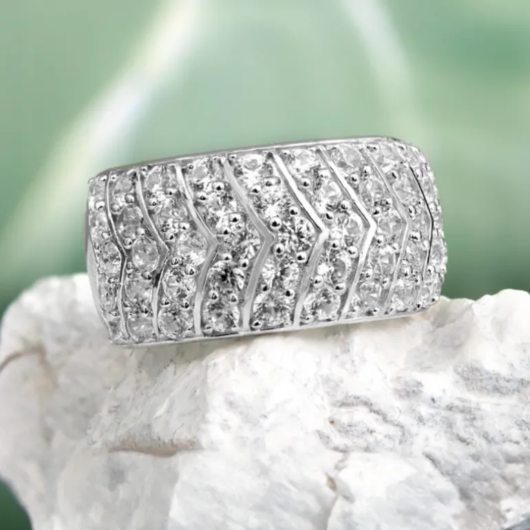 Entdecken Sie die strahlende Anziehungskraft dieses schillernden Rings aus Sterlingsilber mit 50 präzisionsgeschliffenen Zirkonen aus Kambodscha von insgesamt 2,25 Karat, gefasst in einem modernen Streifendesign. Der aus hochwertigem 925er Sterlingsilber gefertigte Ring hat eine moderne Silhouette von 21×21 mm, die jede Kleidung elegant ergänzt. Die funkelnden Steine im Rundschliff fangen das Licht wunderschön ein und machen diesen Ring zu einem idealen Accessoire sowohl für zwanglose als auch für besondere Anlässe.