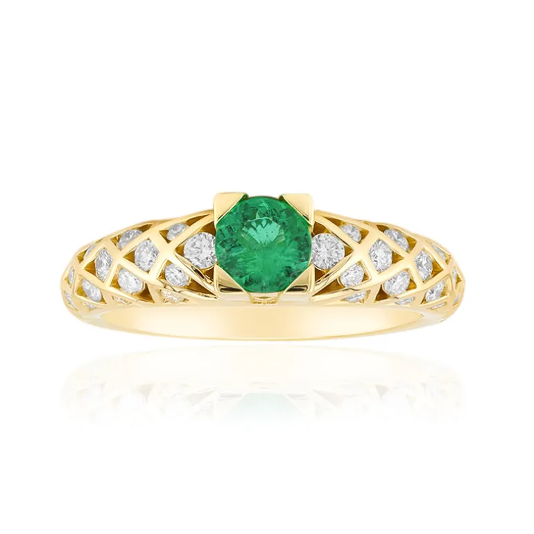Entdecken Sie die Eleganz dieses exquisiten Goldrings mit einem äthiopischen Smaragd von 0,43 Karat AAA im faszinierenden runden Brillantschliff. Ergänzt durch funkelnde SI2 (H) Diamanten, strahlt das Band aus 585er Gelbgold Raffinesse aus. Dieses Schmuckstück eignet sich perfekt für besondere Anlässe oder als luxuriöser Begleiter im Alltag und passt sowohl zu Abendkleidern als auch zu eleganten Freizeitoutfits.