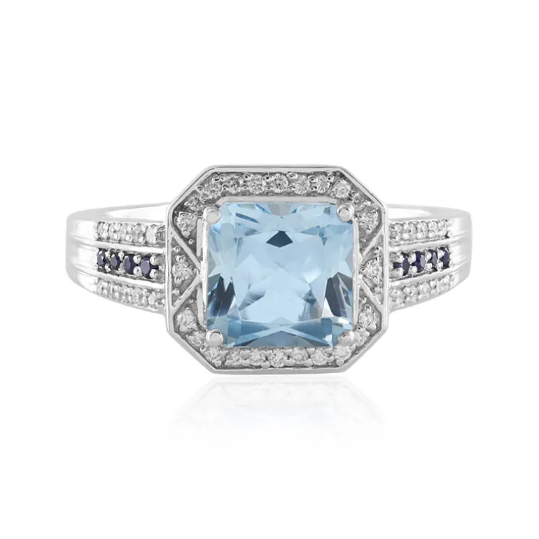 Dieser Ring aus 585er Weißgold ist der Inbegriff von Eleganz. Er enthält einen atemberaubenden brasilianischen Aquamarin von 2,025 Karat mit der begehrten AAA-Einstufung. Der achteckige Schliff des Aquamarins unterstreicht seinen faszinierenden blauen Farbton und macht ihn zu einem optischen Genuss. Akzentuiert mit blauen Saphiren aus Thailand und einem Pavé aus SI2 (H) Diamanten von insgesamt 0,202 ct. zieht dieser Ring Licht und Aufmerksamkeit auf sich. Das raffinierte Design schafft ein Gleichgewicht zwischen zeitloser Tradition und moderner Anziehungskraft und eignet sich perfekt, um Ihrer Abendgarderobe einen Hauch von Raffinesse zu verleihen oder Ihr Tagesensemble aufzuwerten.