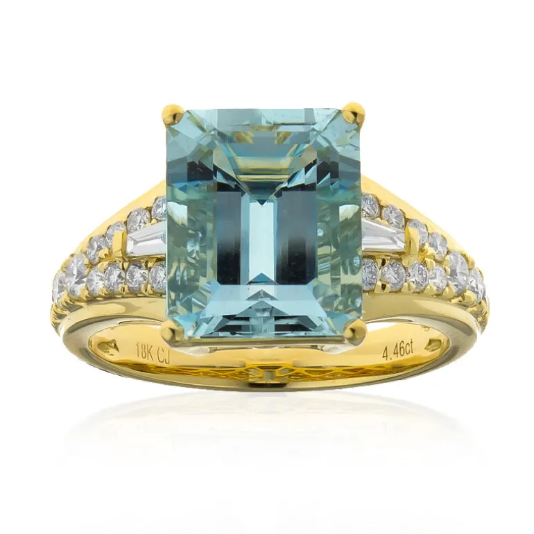 Tauchen Sie ein in die Eleganz dieses exquisiten Rings von CIRARI mit einem atemberaubenden brasilianischen Aquamarin von 3,918 Karat im Achteck-Smaragdschliff. Dieses sorgfältig aus 18 Karat Gelbgold gefertigte Schmuckstück wird durch 24 Diamanten SI2 (H) ergänzt. Es ist perfekt für formelle Anlässe und passt hervorragend zur Abendgarderobe. Setzen Sie auf Raffinesse und lassen Sie diesen Ring zum Highlight Ihrer Schmucksammlung werden.