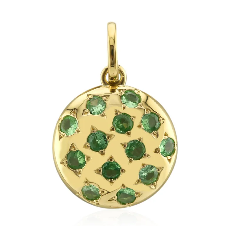 Entdecken Sie die Faszination dieses Anhängers aus 9-karätigem Gold, der eine Konstellation aus 13 funkelnden AAA-bewerteten Tsavoriten aus Kenia mit einem Gesamtkaratgewicht von 0,442 ct zeigt. Jeder rund geschliffene Edelstein ist sorgfältig in reichhaltiges Gold mit einem Gewicht von ca. 1,47 g gefasst, um einen Tanz von leuchtenden Grüntönen zu kreieren. Dieses elegante Schmuckstück eignet sich sowohl für den täglichen Luxus als auch für besondere Anlässe und ist eine vielseitige Ergänzung für jede Schmucksammlung.