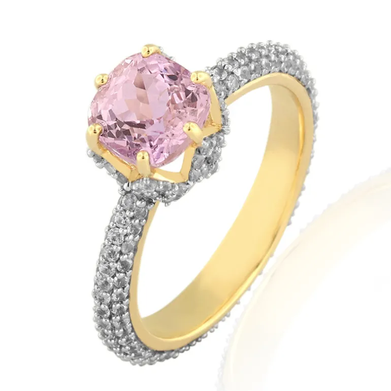 Zelebrieren Sie zeitlose Eleganz mit diesem bezaubernden Ring aus 9-karätigem Gold mit einem AAA-Kunzit im Kissenschliff von 1,8 Karat aus Pakistan. Dieser exquisite Ring ist mit einem Halo aus 186 funkelnden Zirkonen aus Kambodscha akzentuiert, die seinen Glanz noch verstärken. Mit einem Gesamtkaratgewicht von 3,976 ct ist er eine perfekte Mischung aus klassischem Stil und strahlender Schönheit. Er ist ideal, um Ihrer Abendgarderobe einen Hauch von Raffinesse zu verleihen oder Ihre Alltagskleidung mit einem luxuriösen Touch zu versehen. Sein zartes Rosa und sein goldener Schimmer machen ihn zu einem echten Hingucker in jeder Schmucksammlung.