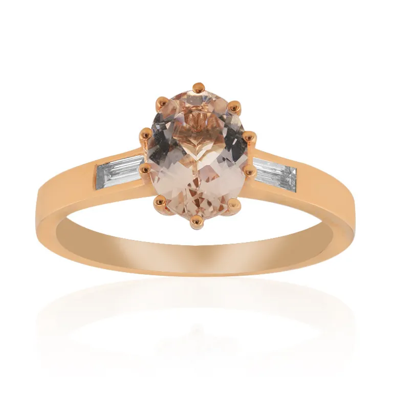 Entdecken Sie die Eleganz dieses AAA-Morganit-Rings, der aus Mosambik stammt und in 10 Karat Roségold gefasst ist. Der 1,23 Karat schwere Edelstein im Ovalschliff wird von zwei Diamanten im Baguetteschliff SI1 (H) ergänzt, die ihm einen Hauch von Brillanz verleihen. Dieser Ring ist sowohl für Tages- als auch für Abendveranstaltungen geeignet und passt sowohl zu formellen als auch zu legeren Outfits, was ihn zu einer unverzichtbaren Ergänzung für jede Schmucksammlung macht.