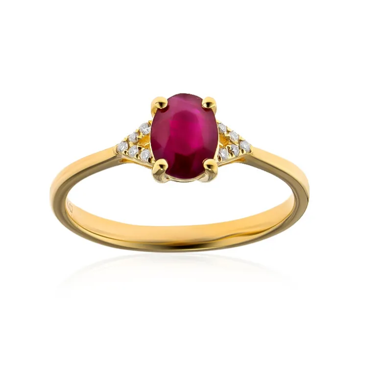 Dieser exquisite Ring besteht aus einem glänzenden 0,86-karätigen Rubin aus Mosambik im perfekten Ovalschliff, der in ein reichhaltiges 14-karätiges Gelbgoldband gefasst ist. Der zentrale Edelstein ist von 10 funkelnden Diamanten der Reinheitsklasse I1 mit einem Gesamtgewicht von 0,037 Karat umgeben, die das feurige Rot des Rubins mit ihrer eigenen Brillanz ergänzen. Das moderne und doch klassische Design des Rings macht ihn zu einer vielseitigen Wahl für das tägliche Tragen oder für besondere Anlässe, denn er lässt sich sowohl mit legerer als auch mit formeller Kleidung kombinieren. Dieser Ring ist ein echtes Zeugnis für raffinierten Geschmack und verleiht jeder Schmucksammlung einen Hauch von Eleganz.