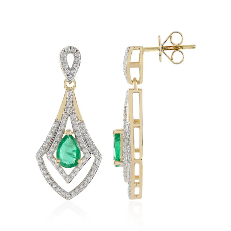 Entdecken Sie die Faszination unserer raffinierten Ohrringe aus 9 Karat Gold mit 1,116 Karat sambischen Smaragden im AAA-Schliff, die zu eleganten Tränen geformt sind. Diese Ohrringe mit einer königlichen Länge von 32 mm sind von 142 kambodschanischen Zirkonen im Rundschliff mit einem Gesamtgewicht von 0,846 ct umgeben. Perfekt für Galas oder ein gehobenes Abendessen. Kombinieren Sie diese Ohrringe mit einem eleganten Kleid, damit ihr grüner Farbton Ihr Ensemble unterstreicht.