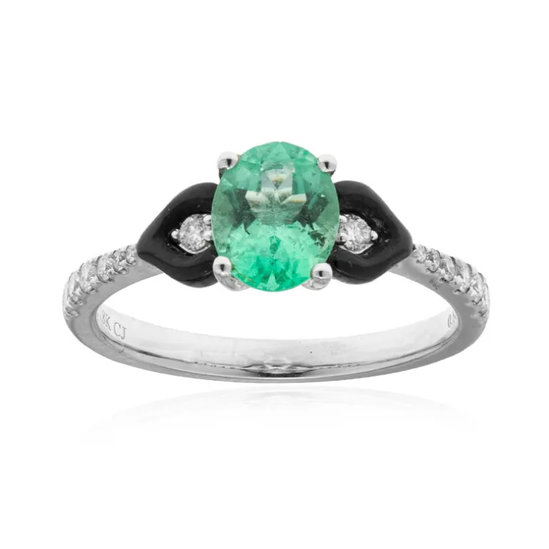Entdecken Sie die Anziehungskraft dieses bezaubernden Rings mit einem üppigen sambischen Smaragd im Ovalschliff von 0,88 Karat AAA, flankiert von zwei raffinierten schwarzen Onyx-Akzenten. Das Ringband aus exquisitem 18-karätigem Weißgold ist mit 14 Diamanten der Reinheit SI1 besetzt, die ihm einen Hauch von Schimmer verleihen. Mit einem Edelsteingewicht von insgesamt 1,45 ct ist dieses Schmuckstück perfekt geeignet, um sowohl am Tag als auch am Abend einen Hauch von Klasse zu zeigen.